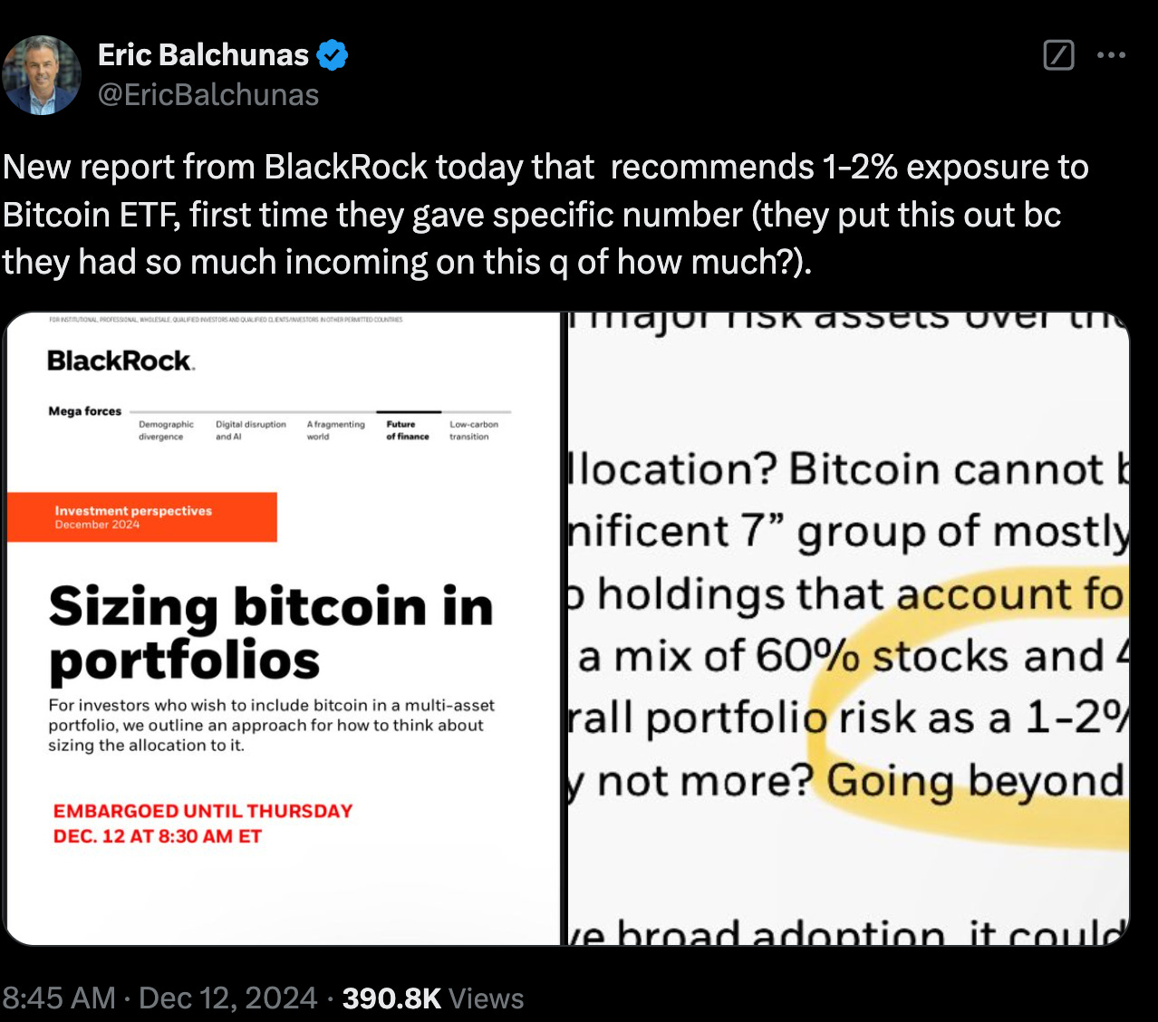 Blackrock, the world's largest asset manager, came out last week and recommended 1-2% exposure to Bitcoin ETF. Morgan Stanley and Goldman Sachs, once notorious for hating crypto, have opened their doors to alternative digital assets.