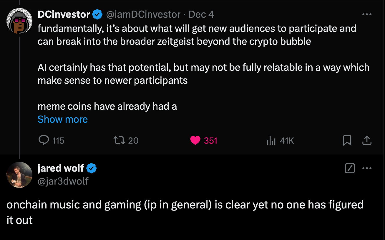 People want access to all music, not just new music uploaded onchain. Gaming is seeing some traction with TG mini apps, but AAA studios still don’t see the value of onchain collectibles or the like.